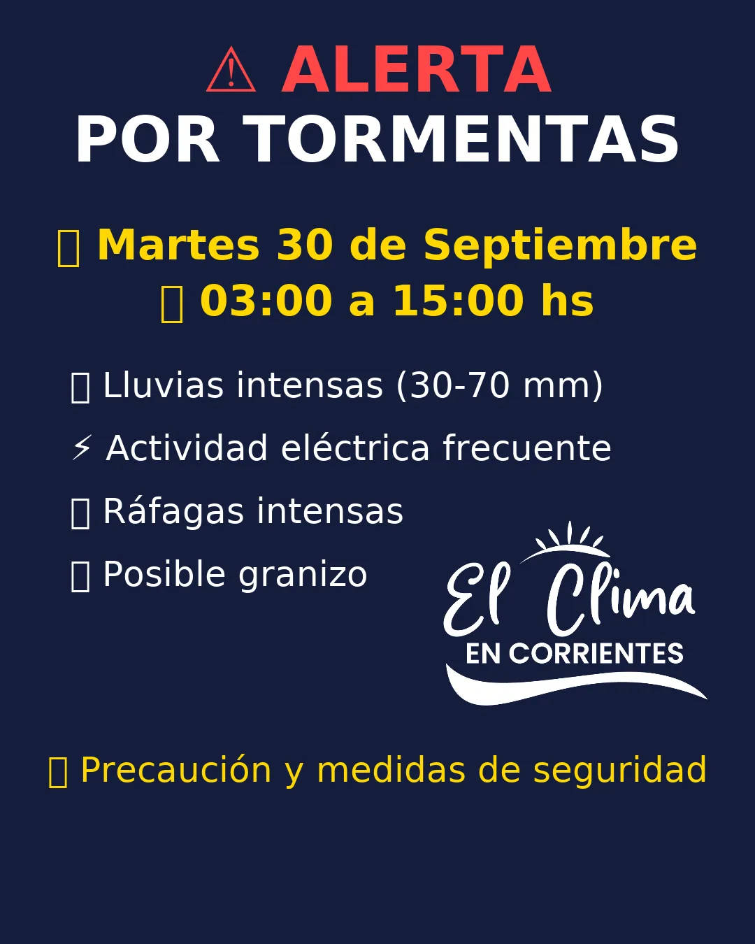Se espera que el área de Corrientes sea afectada por tormentas de variada intensidad, algunas localmente fuertes, entre las 3:00 y las 15:00 del día de mañana. Estas tormentas estarán acompañadas de abundante caída de agua en cortos períodos, frecuente actividad eléctrica, granizo ocasional e intensas ráfagas.