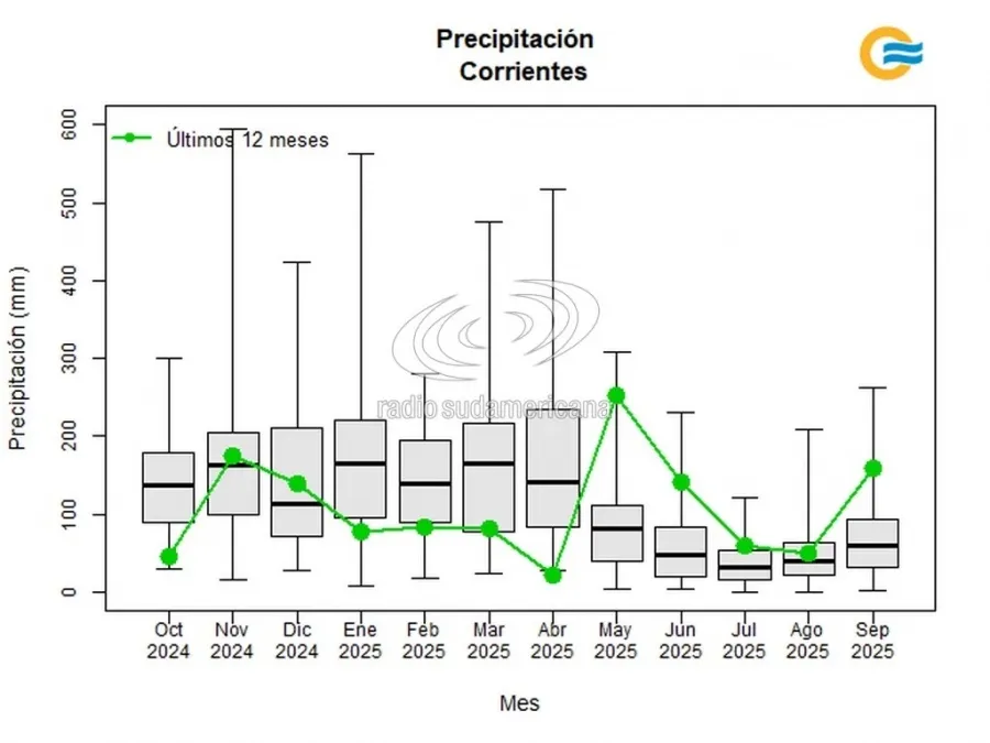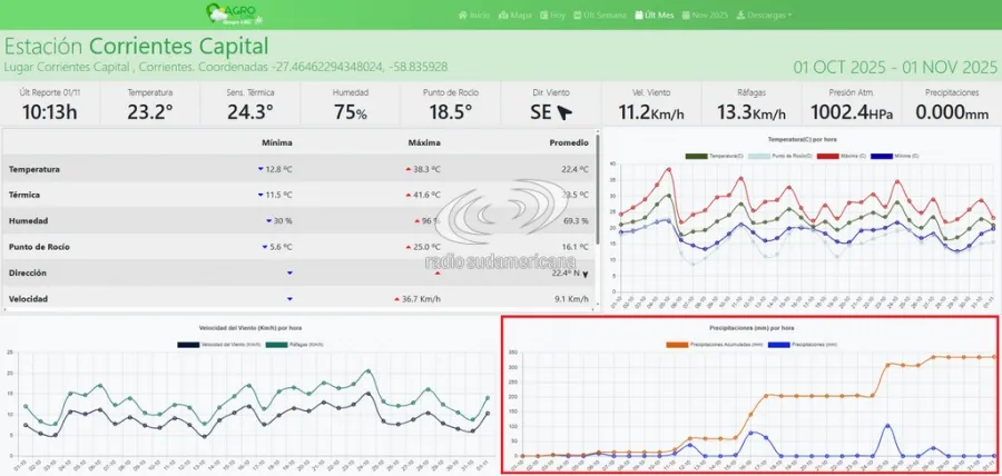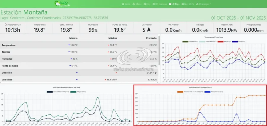 Según los datos oficiales del SMN, medidos en la estación Corrientes Aero (E87166), las precipitaciones acumuladas durante el mes superaron los 330 milímetros, cifra que coincide con los 334,5 mm registrados en la estación central de AgroClima y los 327,9 mm en la estación del barrio Montaña.