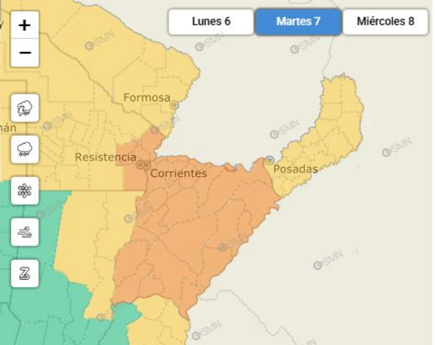 El Servicio Meteorológico Nacional (SMN) mantiene el alerta naranja que afecta a todo el territorio de Corrientes, advirtiendo sobre la llegada de un frente de tormentas, algunas localmente severas, que impactarán con mayor fuerza durante las primeras horas del día martes.Según el organismo, la probabilidad de precipitaciones supera el 70%. El fenómeno estará caracterizado por ráfagas de viento que podrían alcanzar los 90 km/h, una intensa actividad eléctrica y la caída de granizo en zonas puntuales.
