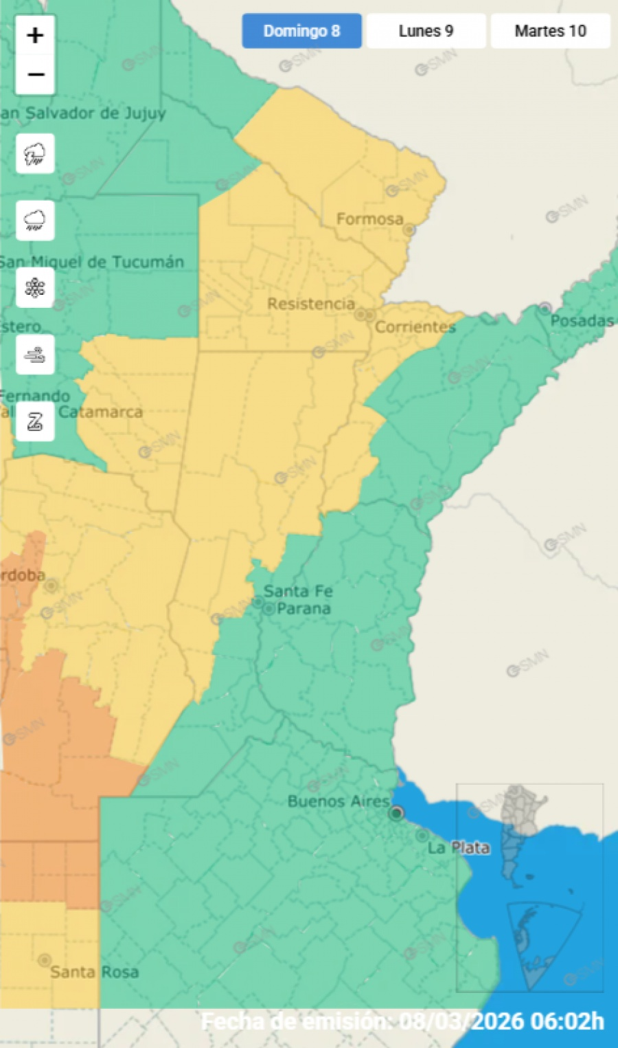 El organismo indicó que el área será afectada por tormentas aisladas de variada intensidad, algunas localmente fuertes. Las mismas estarán acompañadas principalmente por lluvias abundantes en cortos períodos, actividad eléctrica frecuente, ocasional caída de granizo y ráfagas que pueden superar los 60 km/h.