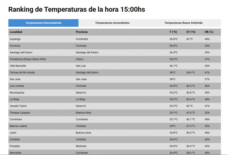 La provincia de Corrientes continúa atravesando jornadas de intenso calor, con registros que la ubican entre las más afectadas del país.De acuerdo al ranking difundido por el Servicio Meteorológico Nacional a las 15hs, la localidad de Ituzaingó encabezó la lista de temperaturas más altas, con 36,6°C y una sensación térmica que alcanzó los 42°C.