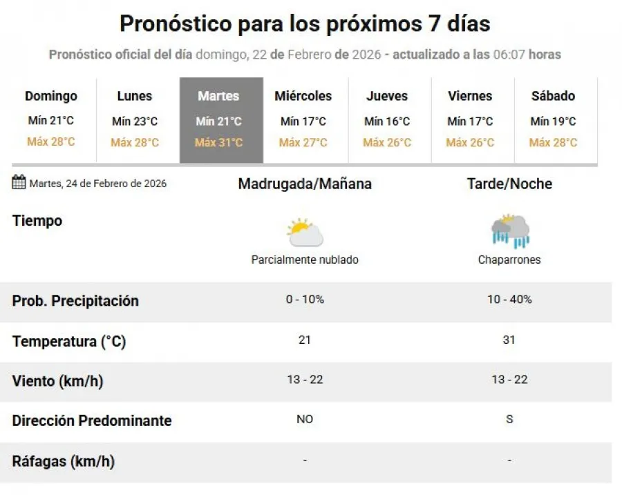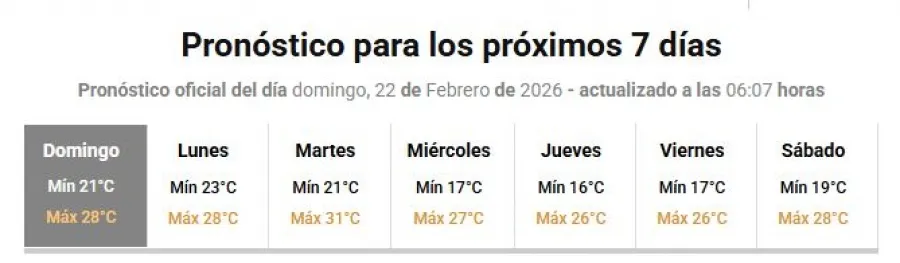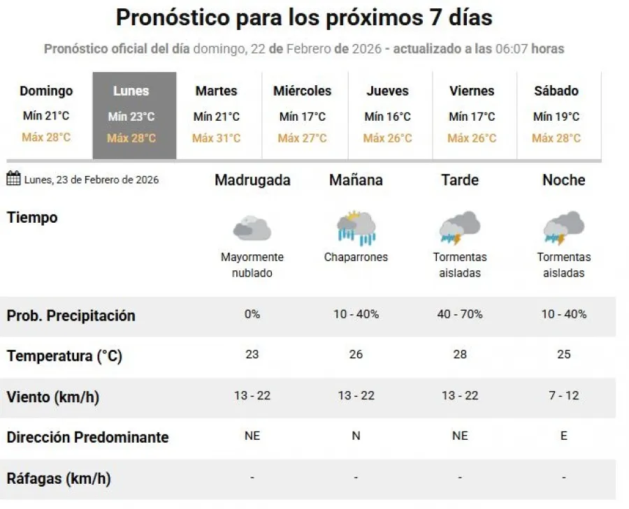 *Para el lunes 23 de febrero se esperan valores que oscilarán entre los 28°C de máxima y los 23°C de mínima. Durante la tarde y la noche podrían registrarse tormentas aisladas.