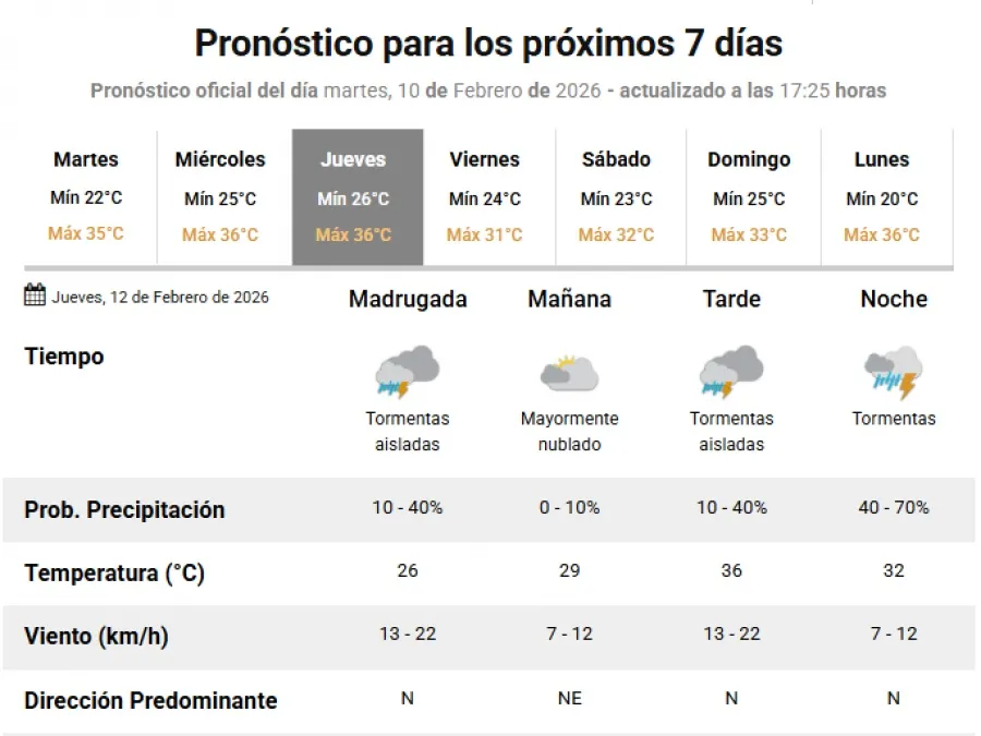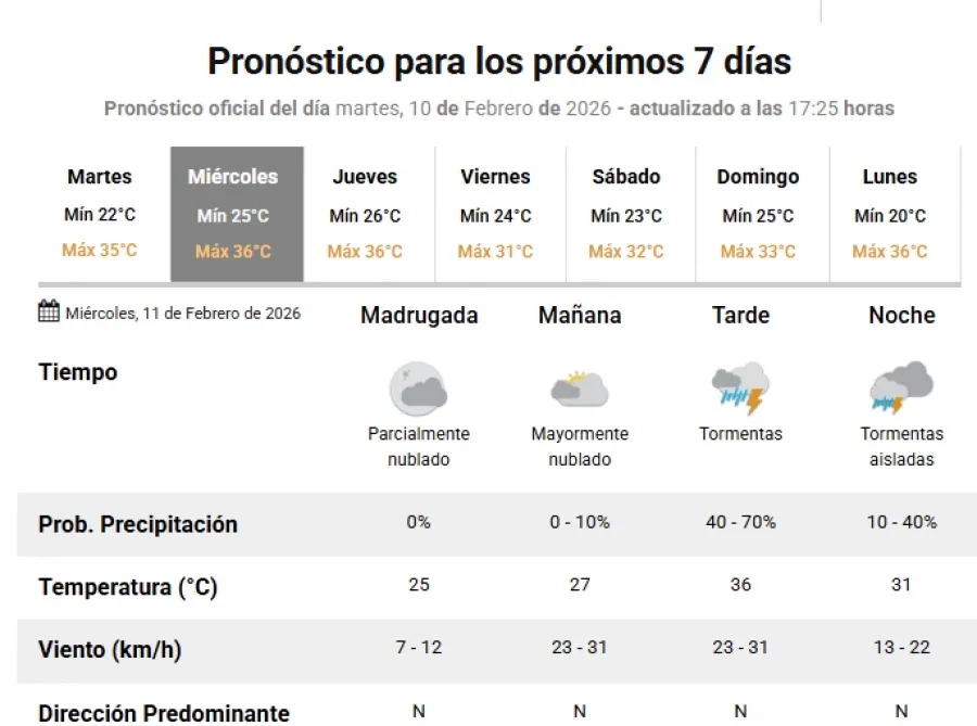 Se esperan temperaturas mínimas de 25°C y máximas que podrían llegar a los 36°C. El día comenzaría parcialmente nublado, con probabilidad de lluvias y tormentas hacia el mediodía y la tarde, con chances de precipitación que oscilarán entre el 40 y el 70% en algunos sectores.